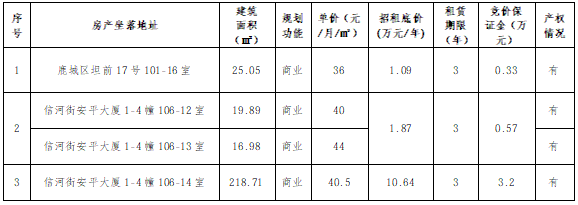 二、承租人条件: (一)意向承租方应为依法设立并有效存续的企业法人、非法人组织或具有完全民事行为能力的自然人。 (二)为企业法人的(国有单位除外),最大股东要为合同履约承担连带担保责任,如最大股东为企业的须追加该企业的最大股东作为连带保证人,如追加的连带保证人还是企业,须再追加一名自然人作为连带保证人,自然人应当具有完全民事行为能力。 (三)已列入“中国执行信息公开网”、“信用中国”和“城发集团租赁”失信人名单的,不得参加本次招租活动。 (四)不接受联合体报名。 (五)符合国家法律法规规定的其他条件。 三、公开拍卖招租相关事项: (一)有意竞买者,个人凭身份证、单位凭有效营业执照副本、法定代表人身份证、公章及本公告交易条件中的相关材料前往温州市佳得拍卖有限公司办理竞买登记手续,并在公告期满日下午5时(报名截止时间)前在“浙交汇”平台完成线上报名手续并完成保证金订单支付,逾期无效。未成交者,保证金5个工作日内无息退还。 (二)竞买保证金:各标的对应的竞买保证金详见表格,以报名截止时间之前到达如下账户为准。(户名:温州联合产权交易中心有限公司,账号:756000120190008655,开户行:温州银行总行营业部)。 (三)报名期截止,若只有一家合格竞买人报名,则该竞买人即被确认为受让方,受让方在报名时的报价即为成交价格,否则视为违约,竞买保证金不作退还。 (四)竞得人须在成交之日起5个工作日内根据成交确认书约定将首期租金及履约保证金足额缴至出租方账户(户名:温州市城市产业发展集团有限公司,开户行:宁波银行股份有限公司温州分行,账号:76010122000573034),并在成交之日起7个工作日内凭交款凭据同出租方签订《房产租赁合同》,办理房产移交手续,租期从签订《房产租赁合同》后的次日开始计算。 (五)租金无递增,均在上一期租金到期前付清,序号1、2房产租金一年一付,序号3房产租金半年一付,先付后用。履约保证金为首年租金成交价的30%(向上取整至佰位)。 (六)租赁房产不得作为只对少数人开放的实行会员制的高档经营场所(私人会所)。 (七)若报名期内没有产生意向承租人的,在不变更公告条件下,以5个工作日为一个周期,延长3个周期即第一个周期2026年1月26日至2026年1月30日下午5时止,第二个周期2026年2月2日至2026年2月6日下午5时止,第三个周期2026年2月9日至2026年2月13日下午5时止,重新接受意向承租人报名,办理相关手续及缴纳竞买保证金,拍卖会时间在报名时告知。 四、报名及联系方式: 报名、看样时间(资产展示安排):2026年1月19日上午9时起至2026年1月23日下午5时止 咨询、报名地点:温州市过境公路1579号方正组团1幢4楼406室 看样地点(资产展示地点):标的所在地 拍卖公司咨询电话:0577-88528852 产业集团咨询电话:0577-89992559 产业集团纪检监察电话:0577-89992556 城发集团业务举报:0577-88566657 城发集团纪检举报:0577-88568983 温州联交中心纪检监督电话:0577-85502266